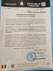 Le Secrétariat général des Affaires religieuses (SGAR) a officiellement annoncé, à travers un communiqué signé de son secrétaire général, Elhadj Karamo Diawara, que la célébration du Maouloud, marquant la naissance du Prophète Mohamed (paix et salut sur lui), aura lieu dans la nuit du jeudi 4 septembre 2025 sur toute l’étendue du territoire national.