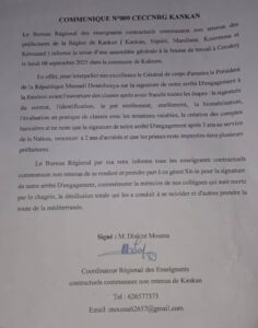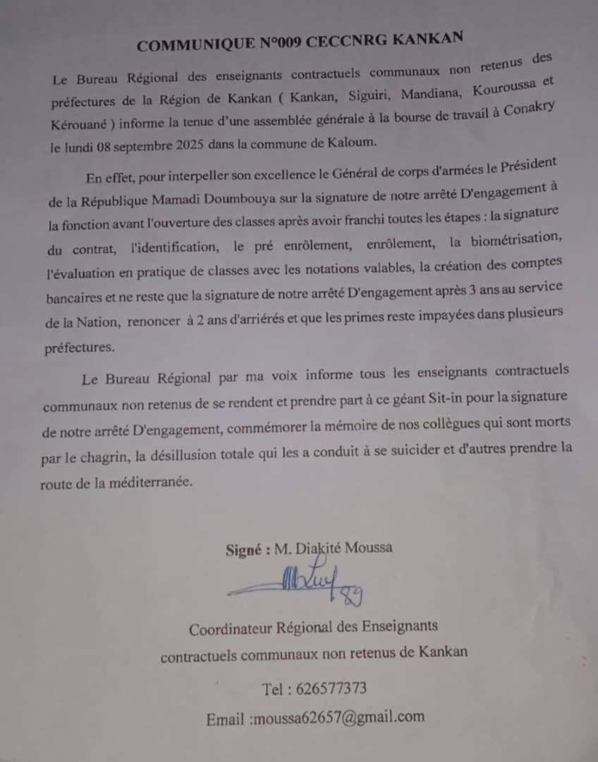 Conakry – Après trois années de revendications restées sans suite, les enseignants contractuels non retenus de la région de Kankan annoncent un sit-in le lundi 8 septembre 2025 à la Bourse du Travail, à Conakry.