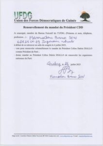 Politique — Nous prenons acte, avec consternation, des documents émanant de M. Bano SOW « ancien » Vice-président chargé des affaires politiques et de Elhadj Djouma BAH, Coordinateur des fédérations de l’extérieure, qui prétend renouveler le mandat de M. Cellou Dalein Diallo à la tête de notre parti, l’UFDG, en dehors de tout cadre statutaire et en violation flagrante de nos textes fondamentaux.