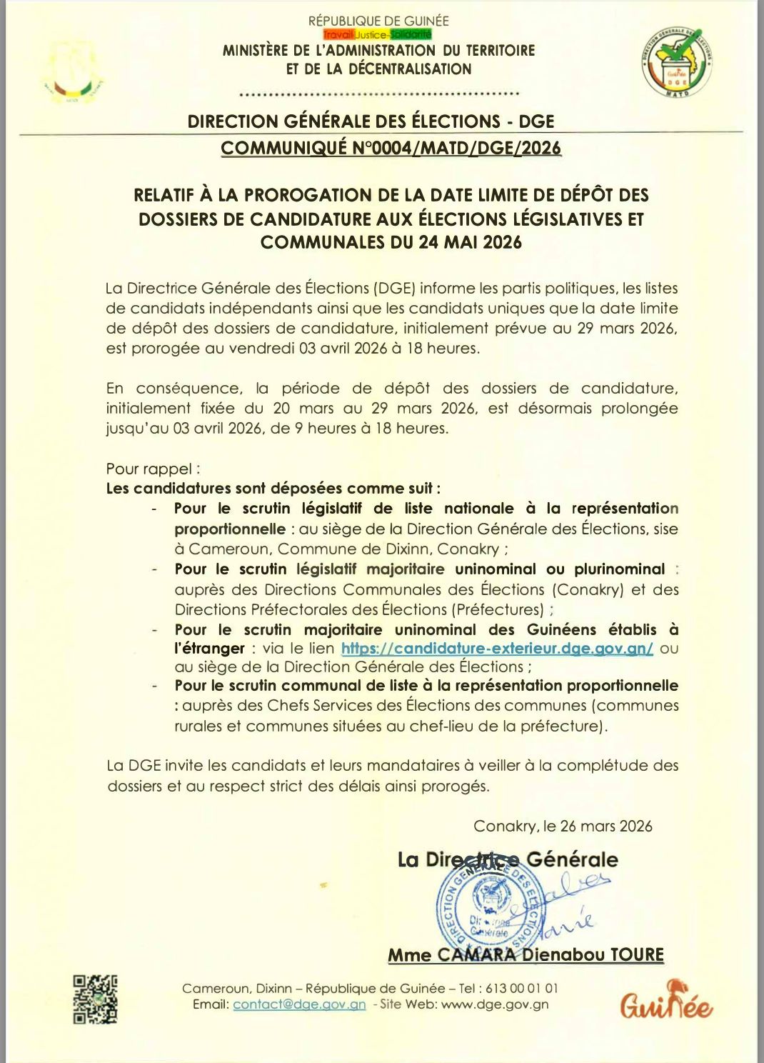 Conakry, 26 mars 2026 – Nouveau rebondissement dans le processus électoral. La Direction Générale des Élections (DGE) a annoncé, ce jeudi 26 mars 2026, le report de la date limite de dépôt des dossiers de candidature pour les élections législatives et communales prévues le 24 mai prochain.