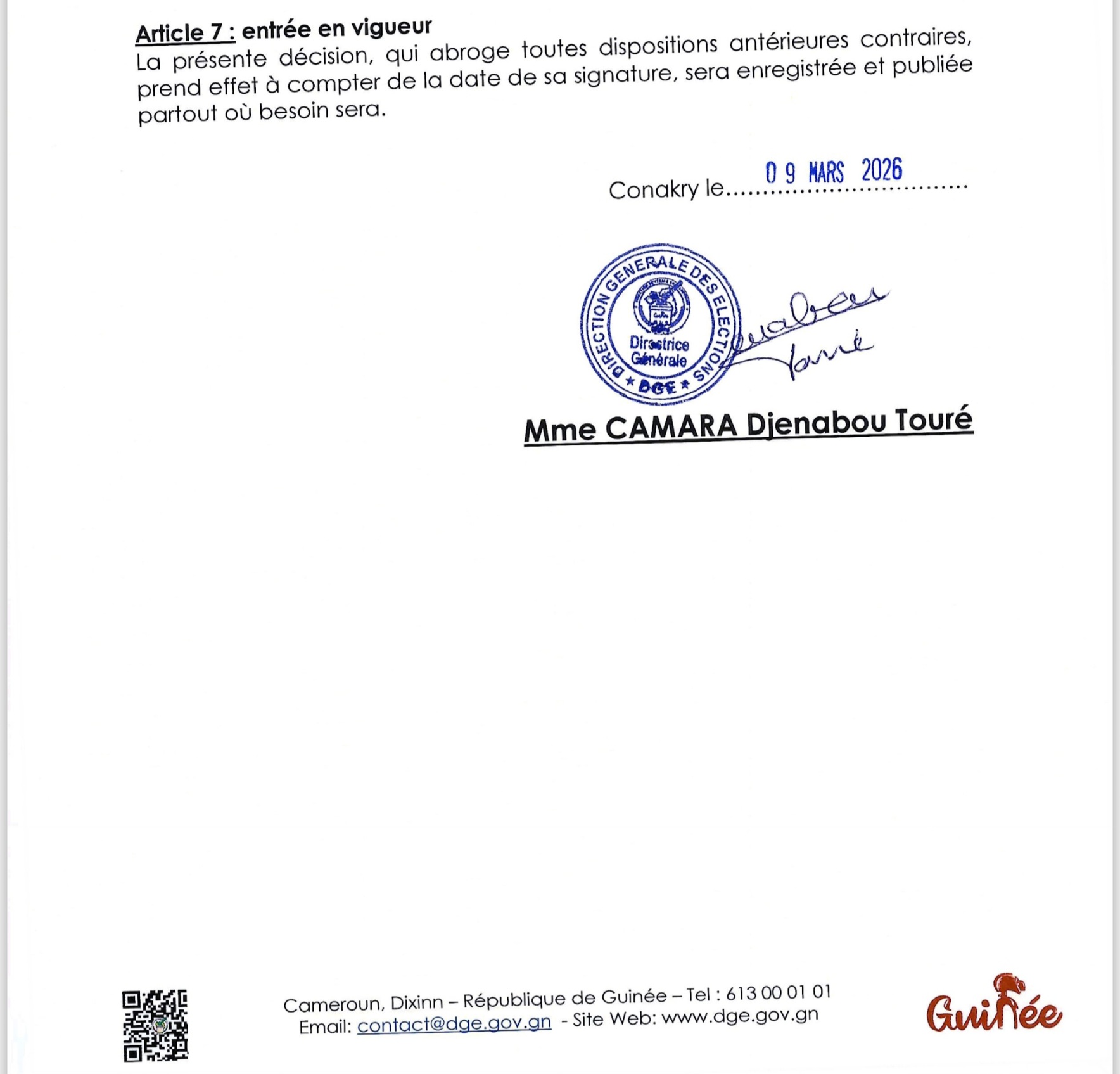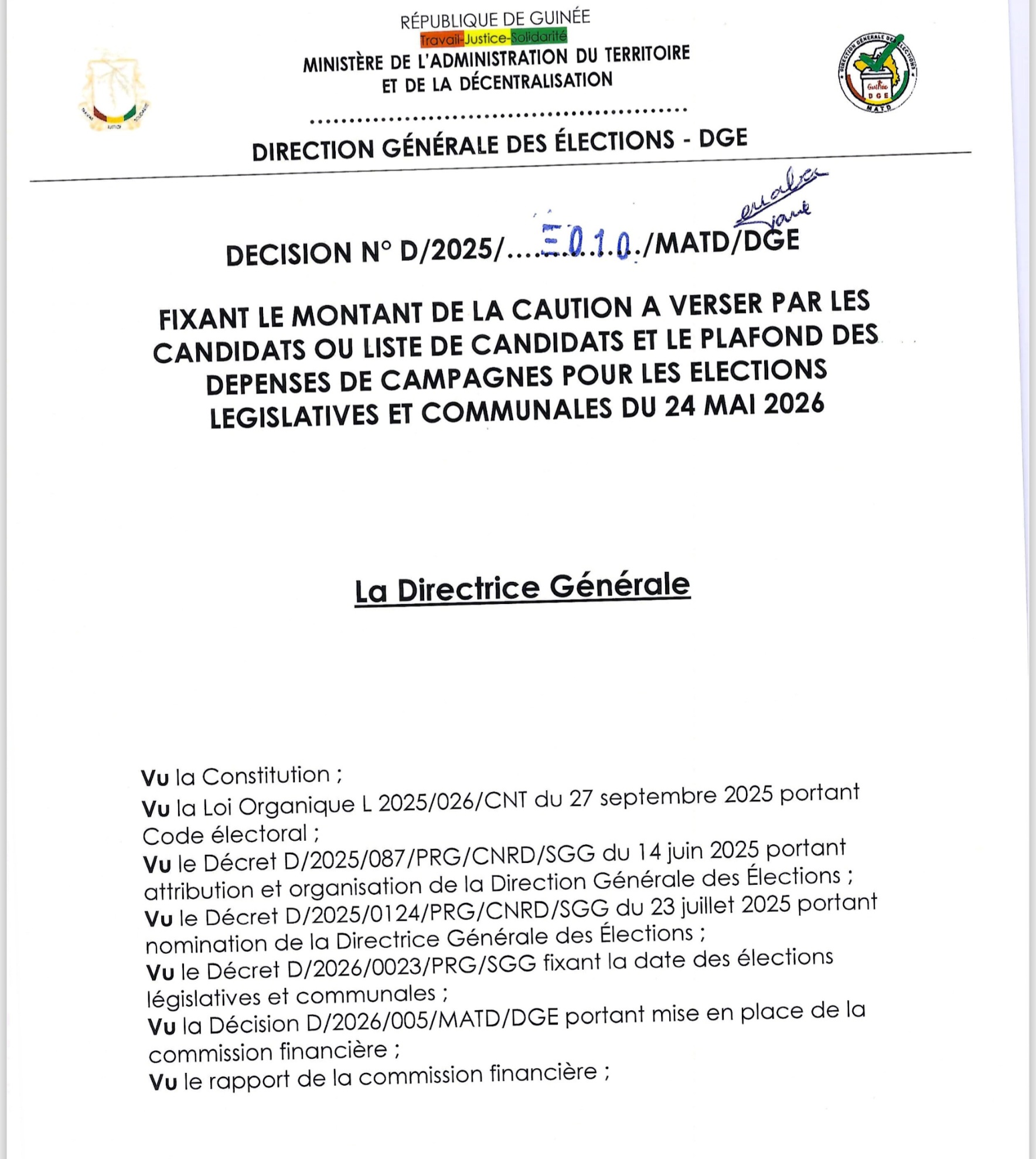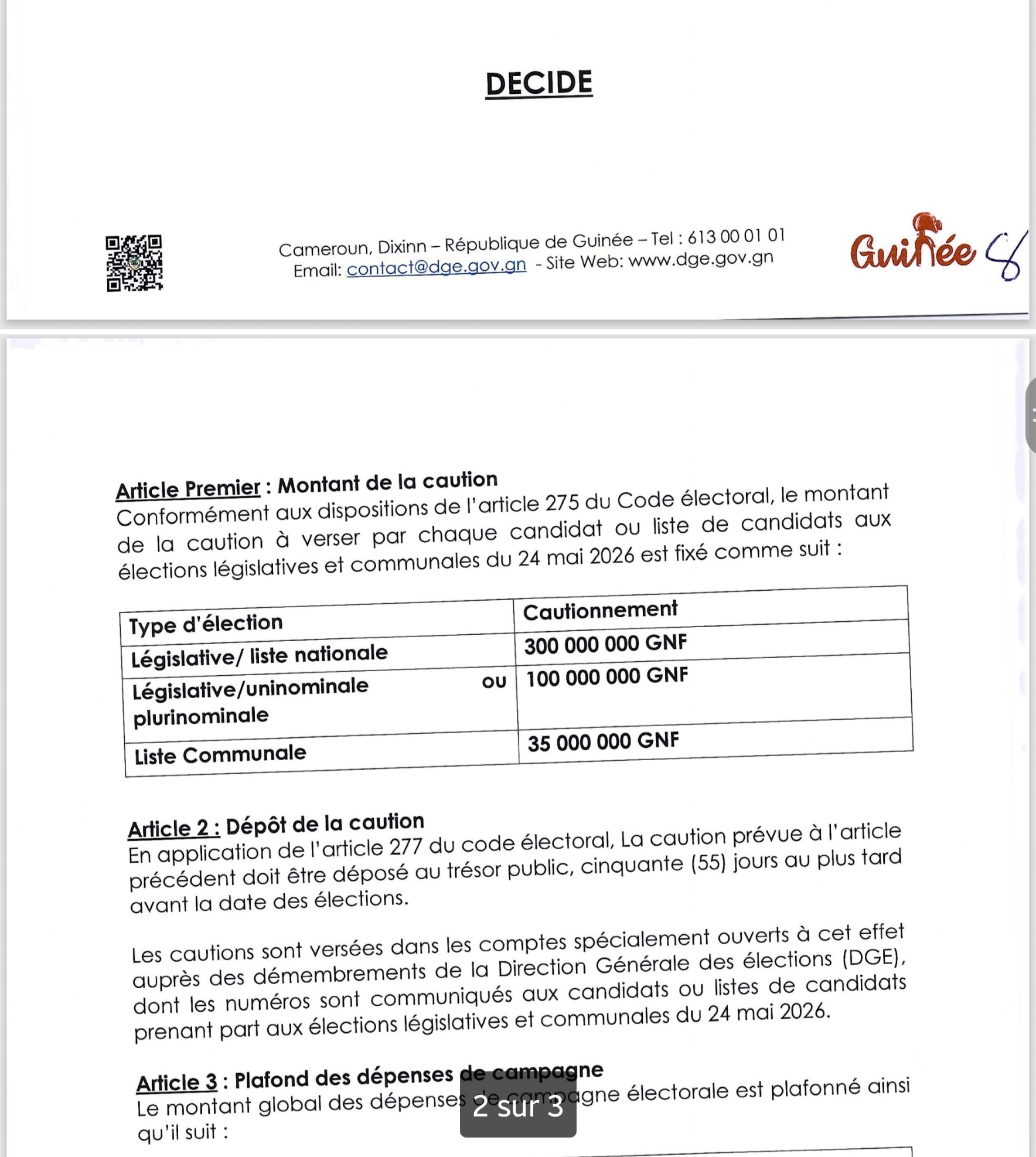 CONAKRY – Le compte à rebours est désormais lancé pour les élections législatives et communales du 24 mai 2026. À un peu plus de deux mois de ce double scrutin crucial, la Direction Générale des Élections (DGE) vient de poser un jalon déterminant dans l’architecture du processus électoral : la fixation officielle des cautions de candidature et du plafonnement des dépenses de campagne.