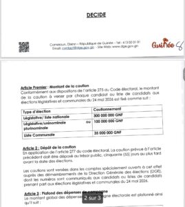 Pour les législatives en circonscriptions uninominales ou plurinominales, le montant exigé est établi à 100 millions de francs guinéens.