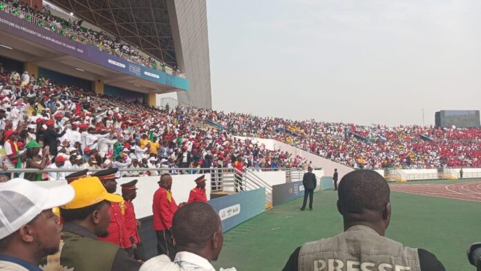 La cérémonie solennelle se déroule au stade Général Lansana Conté de Nongo, dans la commune de Lambanyi, transformé pour l’occasion en épicentre du pouvoir et de l’histoire nationale. Dès les premières heures de la matinée, une marée humaine, drapée des couleurs nationales, converge vers l’enceinte sportive. Chants patriotiques, slogans d’unité et ferveur populaire donnent le ton d’un moment que beaucoup qualifient déjà d’exceptionnel.