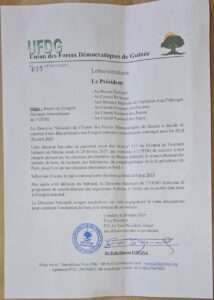 Cette décision fait suite à une ordonnance du Tribunal de Première Instance de Dixinn, rendue le 28 février 2025, qui interdit la tenue de tout congrès visant l’élection des membres du bureau exécutif ainsi que le renouvellement des structures du parti, notamment les comités de base, les sections, les fédérations, le conseil politique et la présidence. Cette interdiction restera en vigueur jusqu’à ce qu’une décision soit rendue sur le fond du dossier.