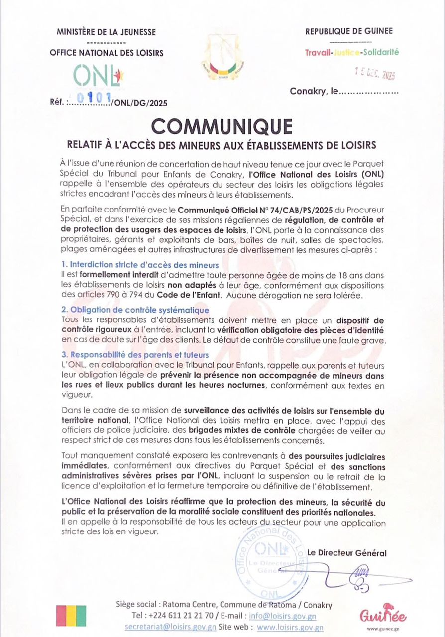 Conakry — L’heure n’est plus aux avertissements. À l’issue d’une concertation de haut niveau avec le parquet spécial du Tribunal pour enfants de Conakry, l’Office national des loisirs (ONL) passe à l’action. Dans un communiqué sans ambiguïté publié ce lundi, l’institution annonce un resserrement drastique des règles d’accès des mineurs aux lieux de divertissement sur l’ensemble du territoire national.