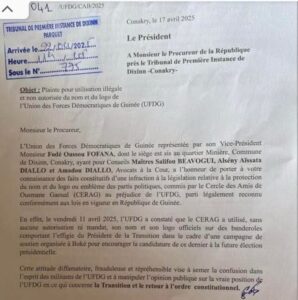 Selon les termes de la plainte déposée auprès du procureur de la République, le parti dirigé par Cellou Dalein Diallo dénonce une violation manifeste de la législation en vigueur sur la protection des noms, logos et emblèmes des partis politiques. L’UFDG estime que l’utilisation de ses attributs officiels par une entité non affiliée constitue une atteinte grave à son image, susceptible d’induire en erreur les citoyens et militants.